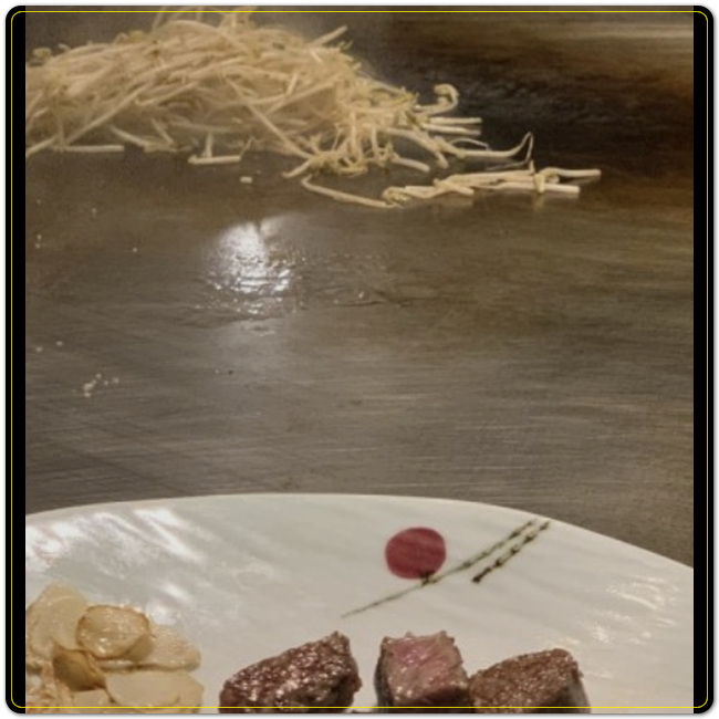 기본으로 단호박 스프를 제공해주고 넓은 불판에 셰프님이 직접 와서 요리하는 모습 하나하나를 볼 수 있습니다. 300도가 넘는 고온에서 굽는만큼 불맛도 즐길 수 있고 무엇보다 직접 요리하는 모습을 볼 수 있다는 것도 흥미롭습니다.