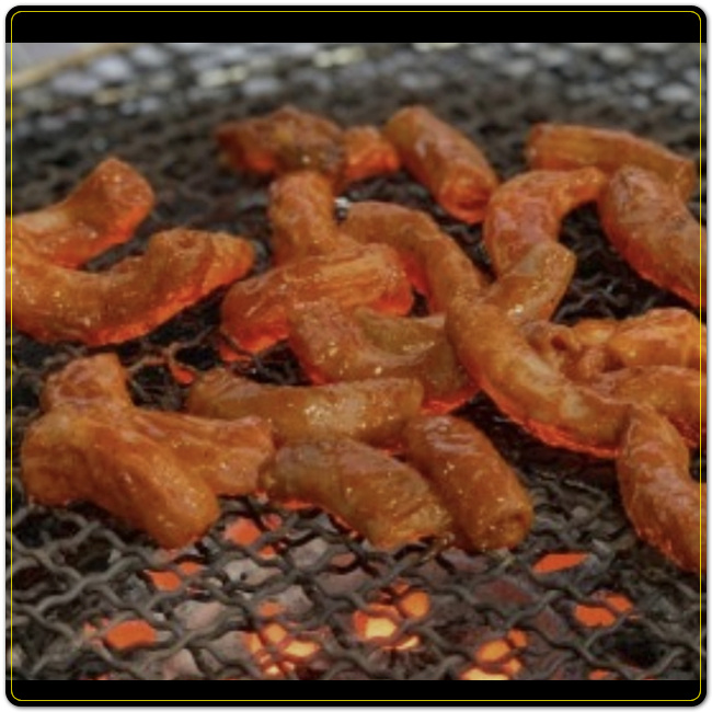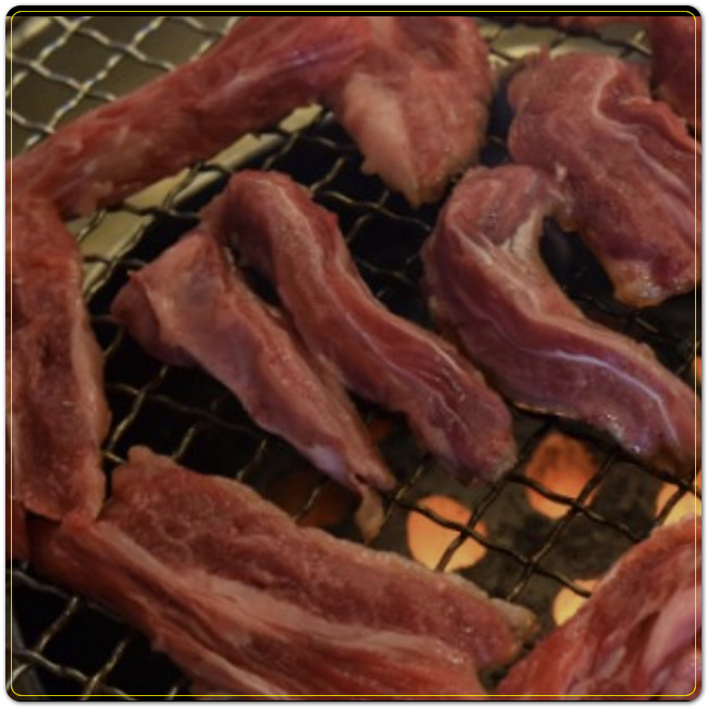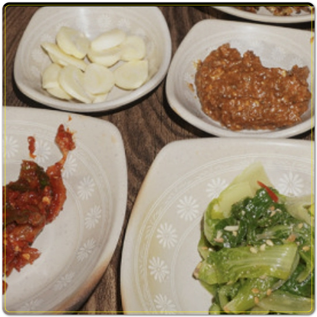 밑반찬으로는 마늘이나 고추, 오이지, 나물장아찌, 쌈장 등이 제공됩니다. 석쇠에 올려서 연탄불에 구워먹으니 숯불향 가득한 맛을 즐길 수 있습니다.